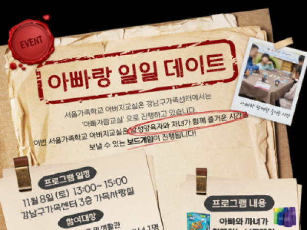 [강남구] 아빠랑 일일 데이트 안내 2025.10.10 서울가족학교 아버지교실 <아빠랑 일일 데이트> ★ 신청링크 : https://gangnam.familynet.or.kr/web/lay1/program/S1T304C450/recruitRecei... - 패밀리넷 신청 시, 남성양육자와 자녀 모두가 신청되어야 합니다. 개인 신청시 취소 되며, 다시 재신청해주셔야 합니다. (재신청한 순번으로 인정됩니다. 참고부탁드립니다.)