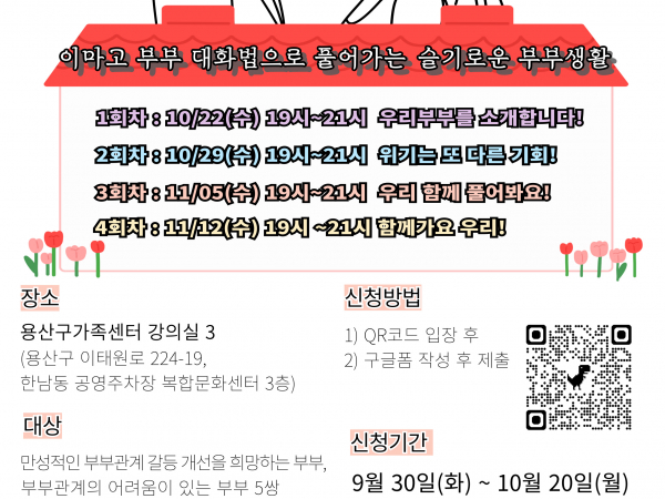 [용산구]이혼전후 부부집단상담 "다시 또, 사랑 connection" 2025.10.02 안녕하세요, 용산구 가족센터입니다. 이혼전후 부부 집단상담 프로그램 '다시 또, 사랑 connection'을 소개해 드립니다. 이마고 부부 대화법으로 부부의 갈등을 슬기롭게 풀어가는 부부 집단상담입니다. 많은 관심과 참여 부탁드립니다. 1.프로그램명: "다시 또, 사랑 connection" 2.일시: -10/22(수) 19:00~21:00 -10/29(수) 19:00~21:00 -11/05(수) 19:00~21:00 -11/12(수) 19:00~21:00 3. 장소 : 용산구가족센터(이태원역 500m)