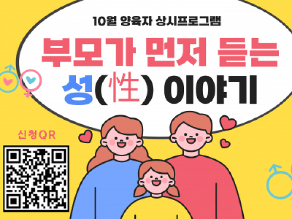 10월 양육자 상시프로그램 '부모가 먼저 듣는 성 이야기' 2025.10.04 💗 2025년 10월 양육자 상시 프로그램 "부모가 먼저 듣는 성 이야기" 참여자 모집 💗 - 모집대상: 서초구 거주 양육자 (회차별 10~16명) (신규가정, 품앗이 회원 우선 접수) - 모집기간: 2025년 10월 04일(토)~ 마감 시까지 - 내용 : 연령대별 아동 성 교육, 성 인지 감수성 교육, 신체 관련 경계 교육 - 참여 확정 문자 안내: 2025년 10월 11일(토)~ / 순차적 안내 예정 - 진행일정 ① 2025. 10. 15.(수) 10:30~12:00(영유아 아동 양육자) ② 2025. 10. 22.(수) 10:30~12:00(영유아 아동 양육자) ③ 2025. 10. 29.(수) 19:30~21:00(아동기 아동 양육자)- 아동 동반 가능 (서초구 사평대로 205 파미에스테이션 2층 / 주차비 미지원) - 신청링크: https://naver.me/xS1YqavV