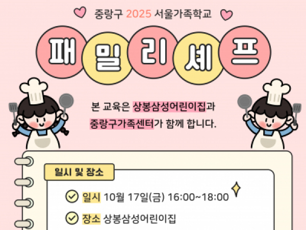 [중랑구] 패밀리셰프(with 상봉삼성어린이집) 2025.10.02 [중랑구가족센터] 패밀리셰프 (with 상봉삼성어린이집) - 일시: 10월 17일(금) 16시~18시 - 장소: 상봉삼성어린이집 - 내용: 가족소통활동 / 집밥의 고수, 패밀리셰프 되기(참치주먹밥&과일파르페 만들기) - 문의: 02-435-4142 * 본 교육은 상봉삼성어린이집과 함께하는 교육으로 참여자 모집이 완료되었습니다.