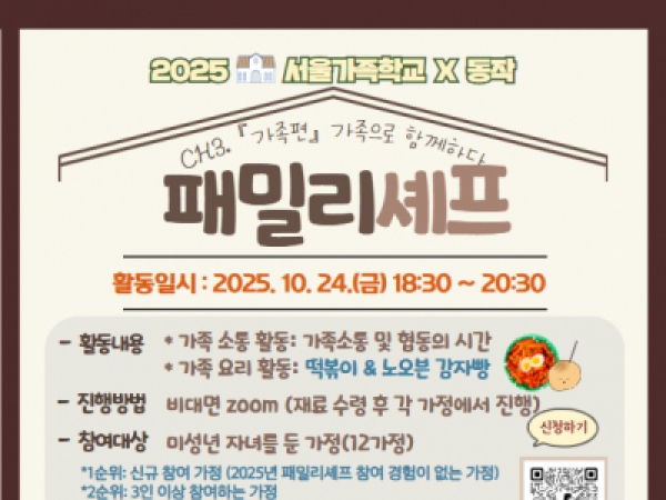 [동작구][2025 서울가족학교X동작] 패밀리셰프 2025.10.10 [2025 서울가족학교X동작] 패밀리셰프 2025 서울가족학교 동작구에서는 패밀리셰프 참여 가족을 모집합니다. '패밀리셰프'는 가족과 함께 요리를 하며 즐거운 대화를 나누는 시간입니다. 여러분의 많은 참여 부탁드립니다. 1. 일정 및 내용 2025. 10. 24.(금) 18:30~20:30 가족소통활동, 떡볶이&노오븐 감자빵 만들기 2. 대상 미성년 자녀를 둔 서울생활권 가정, 12가정 * 1순위: 신규 참여 가정(2025년 패밀리셰프 참여 경험이 없는 가정) * 2순위: 3인 이상 참여하는 가정