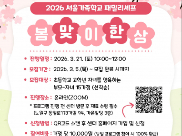[금천구] 2026 아동기부모교실 "학부모상담대비 TIP교육" 2026.03.06 안녕하세요! 금천구가족센터입니다. 자녀의 초등학교 입학을 진심으로 축하드립니다. 🎉 3월 3일, 첫 등교를 앞둔 아이들의 설렘만큼이나 학부모님들의 마음 한편에도 기대와 걱정이 교차하실 것 같습니다. 특히 3월 말부터 시작되는 '교사-학부모 첫 상담'은 자녀의 학교생활 적응을 돕는 매우 중요한 기회입니다. 상담 시기부터 준비 사항, 효과적인 질문 리스트까지! 현직 초등학교 1학년 부장 선생님과 함께 명쾌하게 풀어보는 시간을 마련했습니다. 학부모님들의 고민을 해소하고 학교와 가정이 든든한 파트너가 될 수 있도록, 아래와 같이 교육을 진행하니 많은 참여 바랍니다. ★주요 내용: 학부모 상담 시기 및 진행 방식 이해 상담 전 미리 준비해야 할 체크리스트 선생님께 꼭 드려야 할 질문과 답변 활용법 학교와 가정의 효과적인 연계 지도 방법 ★일시: 2026. 3. 21.(토) 10:00~12:00