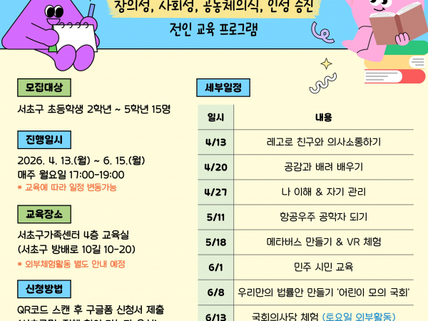 미래 인재로 성장할 수 있도록 돕는 초등 사회성·인성·창의성 프로그램 ‘Grow UP Together’ 3기를 모집합니다.