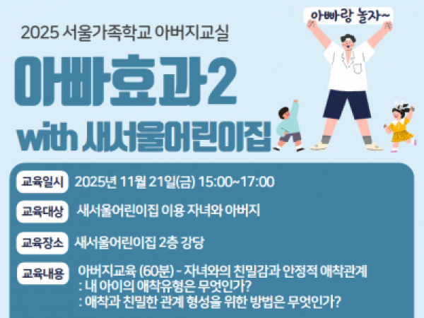 본 교육은 새서울 어린이집 이용 자녀와 남성양육자를 대상으로 진행하므로 따로 모집하지 않습니다.