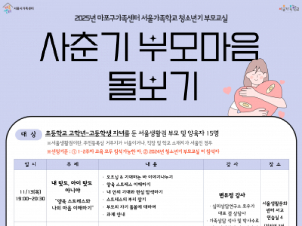 [마포구]청소년기 부모교실 '사춘기 부모마음 돌보기' 참여자 모집