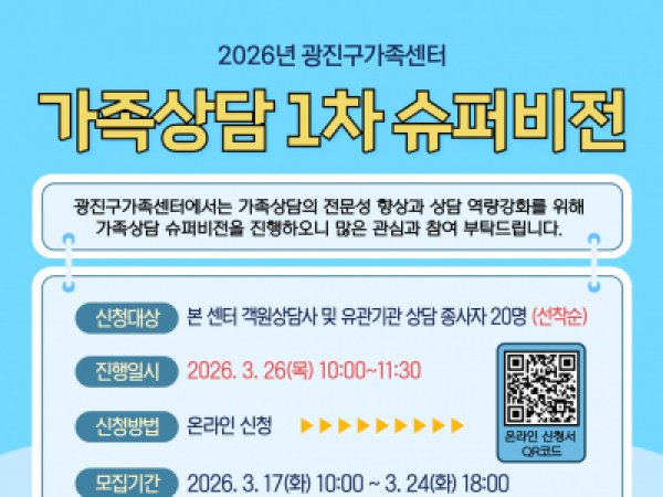 광진구가족센터에서는 가족상담의 전문성 향상과 상담 역량강화를 위한 가족상담 슈퍼비전을 진행하오니 많은 관심과 참여 부탁드립니다.