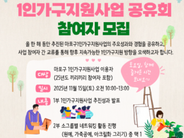 사업 참여자 간 교류를 통해 향후 지속가능한 1인가구지원 방향 모색하고자 공유회를 진행됩니다.