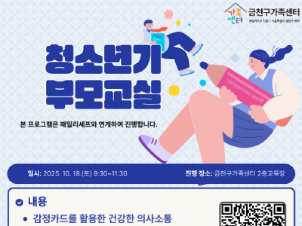 [금천구] 2025 청소년기부모교실 2025.09.10 안녕하세요, 금천구가족센터입니다. 2025 서울가족학교 '청소년기부모교실' 참여자를 모집하고 있으니 많은 관심과 참여 부탁드립니다. ★일시: 2025년 10월 18일(토) 9:30~11:30 ★장소: 금천구가족센터 2층교육장 ★대상: 8~11세 자녀와 양육자 15가정 ★내용: 1. 부모 자녀 사이의 걸림돌 찾기 2. 자녀와의 의사소통 문의) 070-7487-5509