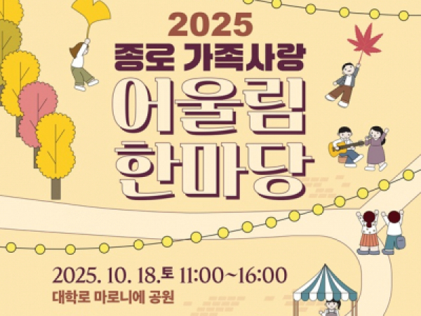 [종로구] 2025년도 종로 가족사랑 어울림 한마당 개최 2025.09.29 2025년도 종로 가족사랑 어울림 한마당 개최 안녕하세요? 종로구 가족센터는 종로구민과 시민들이 함께 참여할 수 있는 "2025년도 종로 가족사랑 어울림 한마당"을 개최합니다. 대학로 마로니에 공원에서 진행하오니, 많은 관심과 참여 부탁드립니다. 📅일시 : 2025. 10. 18.(토) 11:00 ~ 16:00 🔍대상 : 종로구민 및 일반시민 누구나