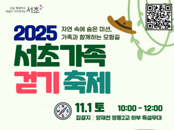 [서초구] 2025 서초 가족 걷기 축제 2025.09.29 [2025 서초가족 걷기 축제 ] O 모집기간 : 2025. 9. 22.(월 )~선착순 모집 O 참여대상 : 서초구 거주 130 가족 O 행사일시 : 2025. 11. 1.(토 ) 10:00~12:00 O 집결지 : 양재천 영동 2 교 하부 특설무대 O 행사내용 : 걷기 (약 3km)+오리엔티어링 등 체험 부스 활동