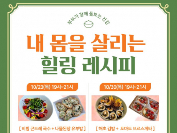 [서초구]내 몸을 살리는 힐링 레시피!(50~60대 대상 저속노화 요리 체험) 2025.09.29 ★신청 링크: https://forms.gle/urMuMLo1Y8wk2y598 행복브릿지 '내 몸을 살리는 힐링 레시피' 50~60대부부가 함께 건강 관리를 위한 저속노화 요리를 하는 프로그램입니다! 불을 사용하지 않으면서 맛있는 한 끼 식사를 만들어 보아요! ★ 모집대상: 50~60대 부부 5쌍(서초구 우선)