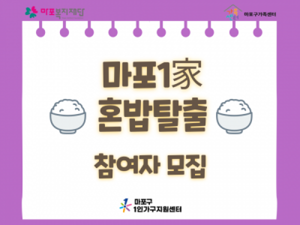 [마포구] 마포1家 혼밥탈출 3기 모집 2025.09.30 마포1家 혼밥탈출 (3기) 함께 식사하는 자리를 통해 1인가구의 관계망 형성에 도움을 드리고자 ‘마포1家 혼밥탈출’이 진행됩니다. 평일 점심시간에 타1인가구와 함께 자유로운 분위기에서 식사를 하시며, 대화를 나누시고 싶은 분들의 많은 참여 부탁드립니다. 1. 대상: 서울시 생활권 중장년(40~67세) 1인가구
