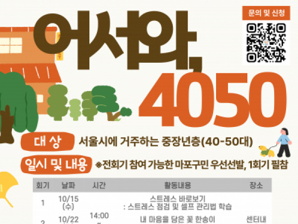 어서와, 4050 (2차) 2025.09.29 📣 중장년층(40~50대) 대상 무료 힐링 프로그램! "어서와, 4050" 프로그램 참가자 모집 중 💐 서울에 거주하는 40~50대 중장년층 분들을 위한 자기 돌봄 & 감성 힐링 시간! 마포구가족센터와 함께하는 3회기 특별 프로그램으로, 나를 돌아보고 리프레시할 수 있는 소중한 기회를 놓치지 마세요! 🟠 참여 대상 서울시 거주 40~50대 중장년 ※ 전회기 참여 가능자 및 마포구민 우선 선발 / 1회기 필참