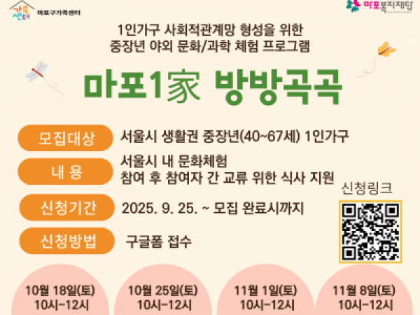[마포구]마포1家 방방곡곡 하반기 참여자 모집 2025.09.30 ‘마포1家 방방곡곡’(하반기) 참여자 모집 중장년(40~67세)의 사회적 관계망 형성을 위한 마포1家_방방곡곡이 진행됩니다. 서울의 이곳저곳을 구경하며 힐링하시고 싶었던 분들의 많은 관심과 참여 부탁드립니다.
