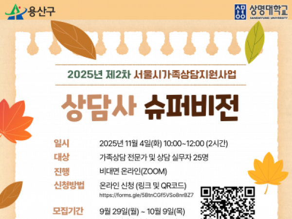 [용산구] 2025년 제2차 상담사 슈퍼비전 2025.09.29 안녕하세요? 용산구가족센터 입니다. 2025년 제2차 상담사 슈퍼비전을 진행하오니 가족상담 전문가 및 상담 실무자 여러분들의 많은 관심과 참여를 부탁드립니다. ○ 일시 : 11월 4일(화) 10시~12시 (총 2시간) ○ 대상 : 가족상담 전문가 및 상담 실무자 25명 ○ 진행 : 비대면 온라인(ZOOM) ○ 신청방법 : 온라인 신청(구글폼 링크 및 QR코드) ▼신청하기▼
