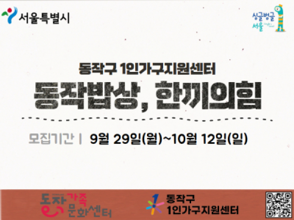 [동작구] 2025년 1인가구 혼밥탈출 프로그램 '동작밥상,한끼의 힘' 5기 2025.09.29 안녕하세요. 동작구1인가구지원센터입니다. 동작구 1인가구 혼밥탈출 프로그램 '동작밥상, 한끼의 힘' 5기 참여자를 모집합니다. ▣ 프로그램 일정 1회기 : 2025.10.15.(수) 12:00 ~ 15:00 2회기 : 2025.10.22.(수) 12:00 ~ 15:00 3회기 : 2025.10.29.(수) 12:00 ~ 15:00 ▣ 프로그램 내용 1~3회기 : 함께 점심식사를 하고, 동작구 내 명소 탐방하기 (산책위주 활동)